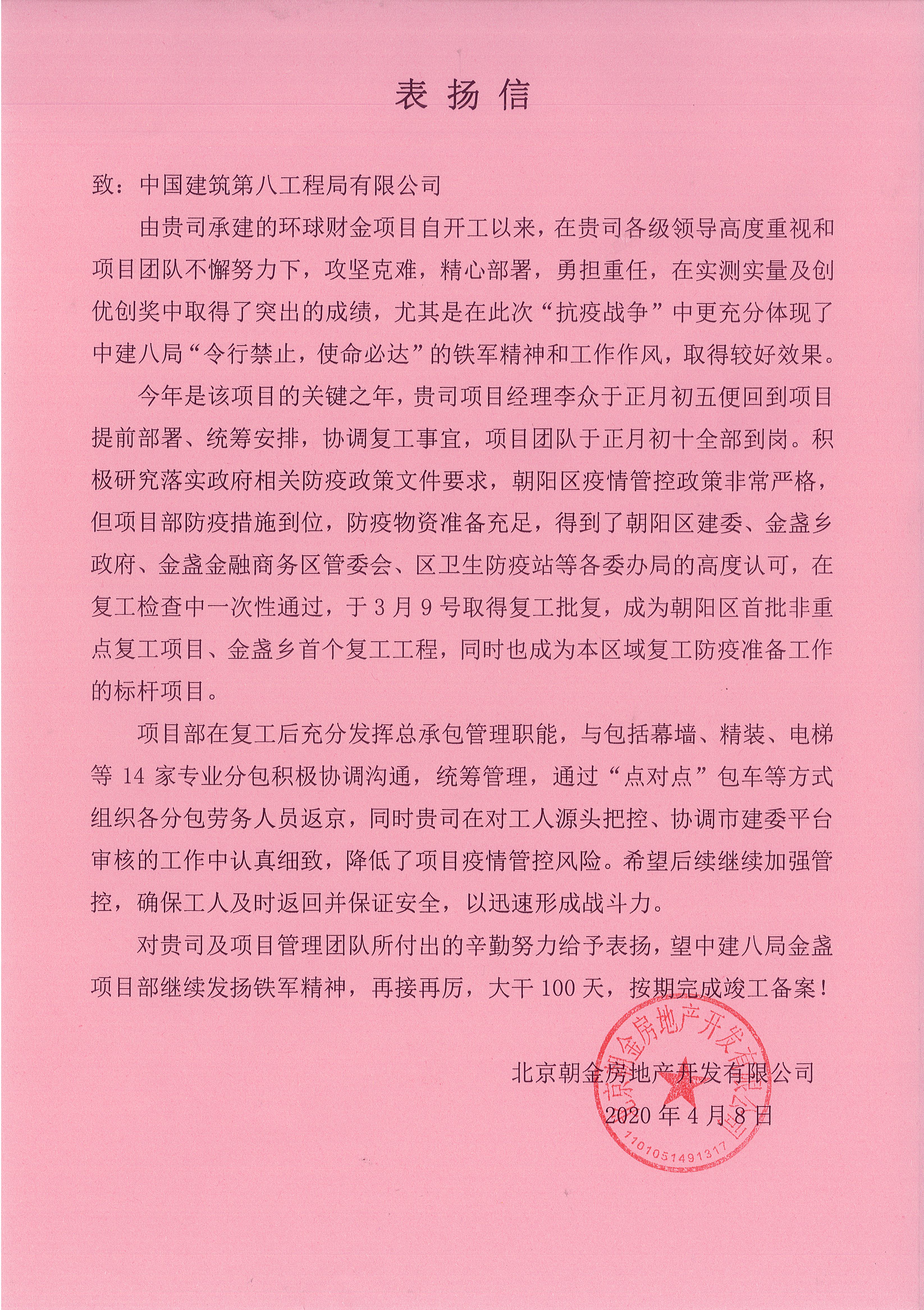 表?yè)P(yáng)信中提到,在此次抗擊疫情中,金盞項(xiàng)目防疫物資準(zhǔn)備充足,疫情管控措施到位,得到了朝陽(yáng)區(qū)建委、金盞鄉(xiāng)政府、金盞金融商務(wù)區(qū)管委會(huì)和區(qū)衛(wèi)生防疫站等各級(jí)單位的高度認(rèn)可,在復(fù)工檢查中一次性通過(guò),成為朝陽(yáng)區(qū)首批非重點(diǎn)復(fù)工項(xiàng)目、金盞鄉(xiāng)首個(gè)復(fù)工項(xiàng)目,同時(shí)也成為本區(qū)域復(fù)工防疫準(zhǔn)備工作的標(biāo)桿項(xiàng)目,同時(shí)能夠在復(fù)工后充分發(fā)揮總承包管理職能,積極協(xié)調(diào)各參建單位。