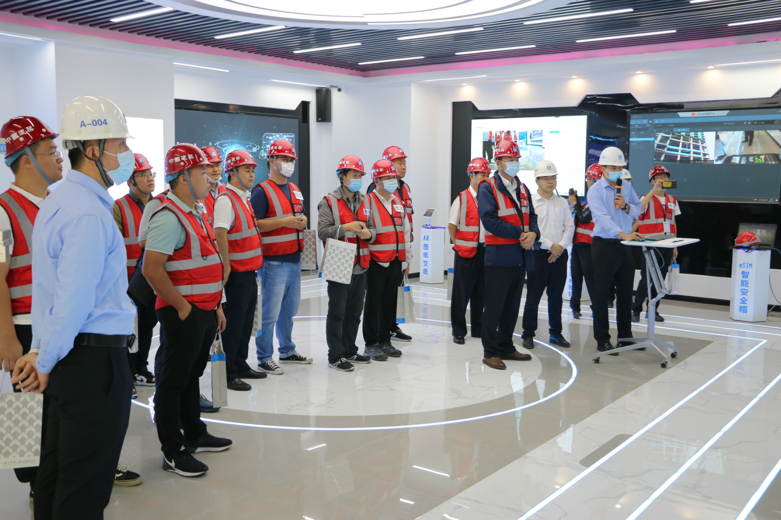 觀摩團隊在管理人員的帶領下進入現場,相繼參觀了RAD八一智能建造館、BIM技術應用展區、安全可視化體驗區、虛擬安全體驗區、黨建文化館等展館,并到頂層爬模進行了參觀。