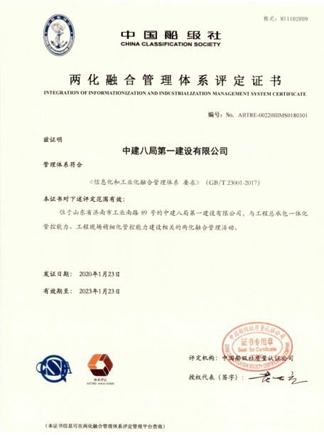 近日,中建八局一公司兩化融合管理體系通過工信部審核并公示,順利取得中國船級社頒發的《兩化融合管理體系評定證書》,評定范圍包含:工程總承包一體化管控能力、工程現場精細化管控能力建設相關的兩化融合管理能力。