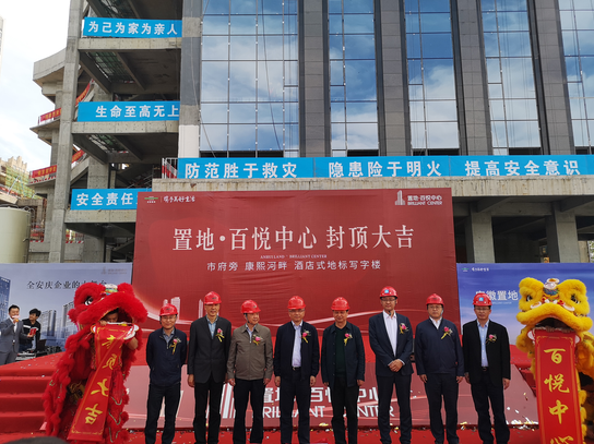 4月18日上午9時整,安慶置地·百悅中心項目隆重舉行A1主樓封頂儀式。 安慶市政府副秘書長畢圣國、安慶宜秀區副區長汪沛、安慶市住房和城鄉建設局副局長王武、安慶市住房和城鄉建設局房地產市場監管科科長丁邦朝、安慶市宜秀開發區管委會副主任王曉峰、中建八局一公司華中公司經理曹明國、招商銀行安慶分行行長宋騁、安徽置地安慶區域公司總經理胡奇參加了此次封頂儀式。