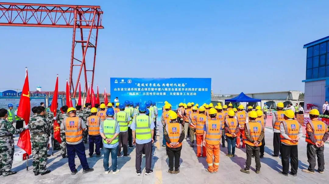 開啟夏日攻堅,建功交通強國。 5月27日,山東省交通系統重點項目暨中建八局“鐵軍杯”示范性勞動競賽、關愛服務工友活動在中建八局承建的京臺高速齊濟段改擴建項目正式啟動,吹響履約奮進“沖鋒號”。
