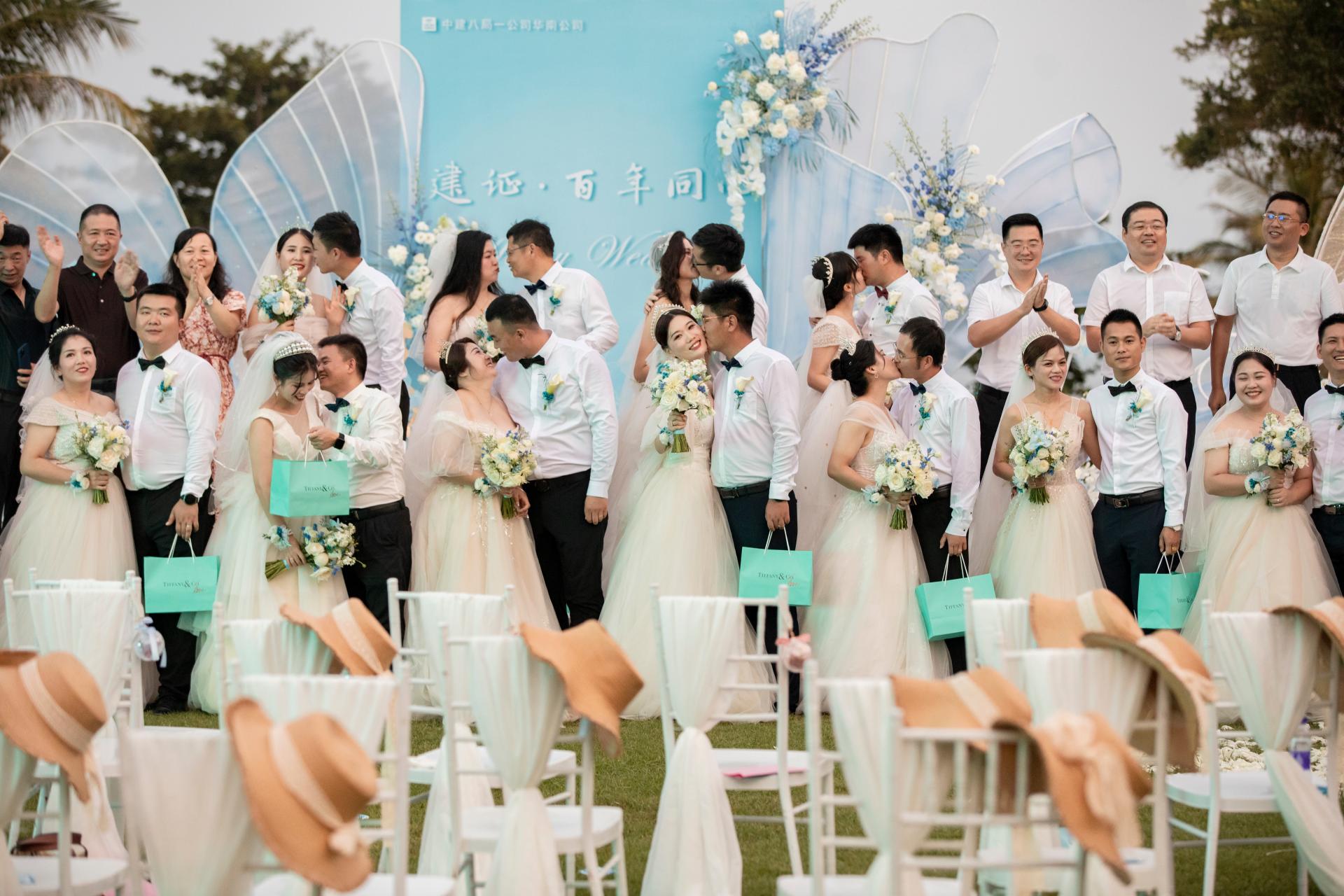 椰林環(huán)繞,碧海聽濤,10月10日,在充滿浪漫氣息的三亞天涯海角,中建八一舉辦“建證·百年同心”集體婚禮活動。 13對新人在親友、同事的見證下許下愛情盟誓,走進(jìn)婚姻殿堂。