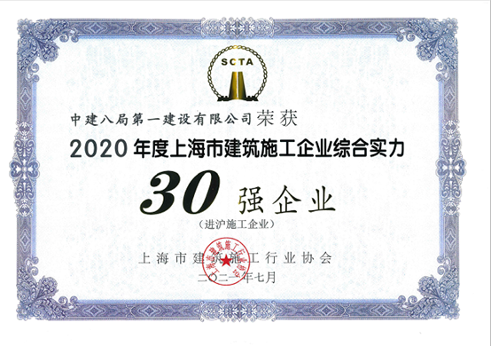 中建八局一公司榮獲“2020年度 上海市建筑施工企業綜合實力30強企業 (進滬施工企業)”稱號