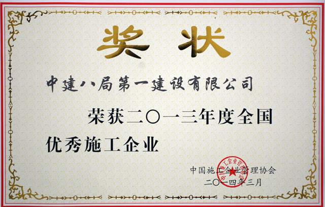 4月19日,中國施工企業管理協會第29次年會在南京召開,會議宣布了《關于宣傳表彰2013年度“全國優秀施工企業”的決定》,公司連續第六年被評為“全國優秀施工企業”稱號。
