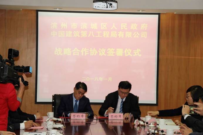 1月22日,中建八局與濱州市濱城區人民政府戰略合作協議簽約儀式舉行。濱城區委副書記、區長張瑞杰,區委副書記王偉武,副區長鄭同忠,區政府相關部門負責人;中建八局副總經理、山東分局局長張作合,山東分局副局長靳慶玉,一公司總經理哈小平、副總經濟師韓成濤,四公司副總經理何中聯等領導出席了本次簽約儀式。