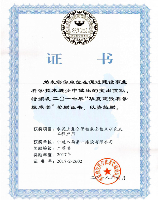 近日,全國建設科學技術領域的最高獎項——華夏建設科學技術獎2017年度獲獎名單揭曉。公司研發的《水泥土復合管樁成套技術研究及工程應用》榮獲二等獎。
