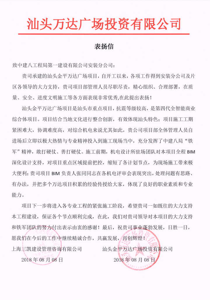 公司安裝公司汕頭金平萬達項目收到業主表揚信
