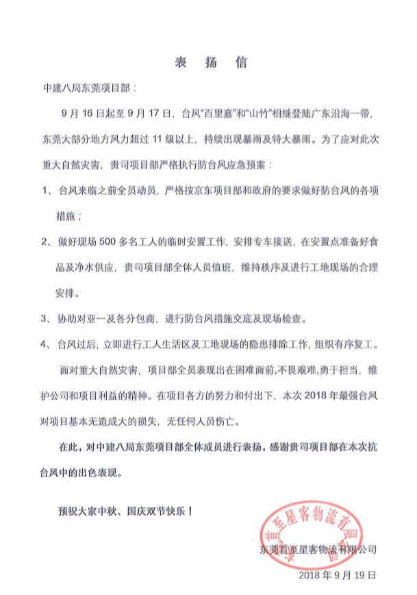 近期,東莞京東項目接到來自業主東莞首至星客物流有限公司的表揚信,對項目部全體成員應對超強臺風“山竹”的出色表現進行表揚及感謝。應對此次超強臺風,項目部嚴格執行防臺風應急預案,按京東項目部和政府的要求做好防臺風的各項措施,妥善安排500多名工人的臨時安置,并在臺風過后立即進行生活區及現場的隱患排除工作,組織有序復工。經項目全員的努力付出,此次2018最強臺風對項目基本未造成大的損失,無任何人員傷亡。京東項目部全體員工也將繼續發揚不畏困難,勇于擔當的精神,維護公司和項目利益。(王曦)