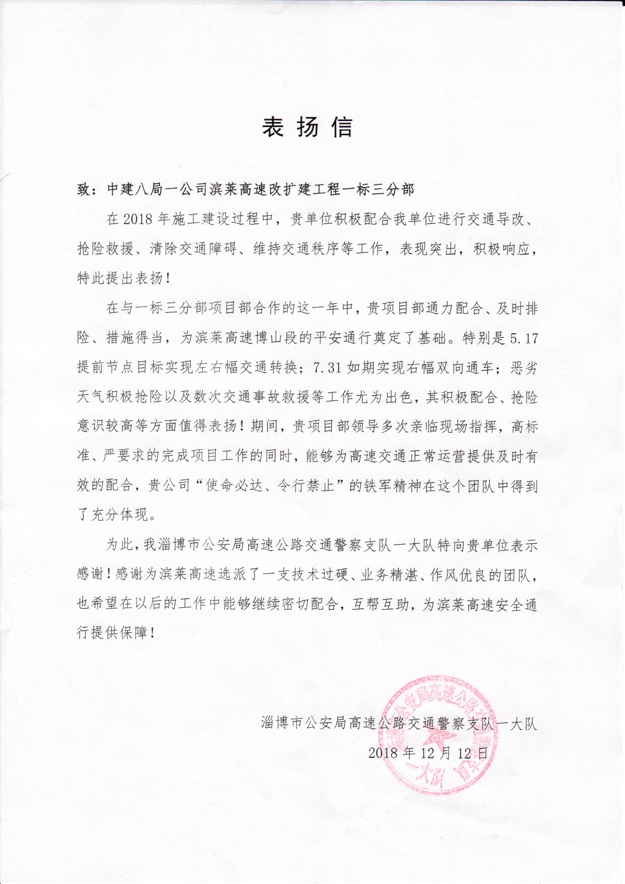 2018年12月14日,濱萊高速改擴建項目喜獲淄博市公安局高速公路交通警察支隊一大隊表揚信。