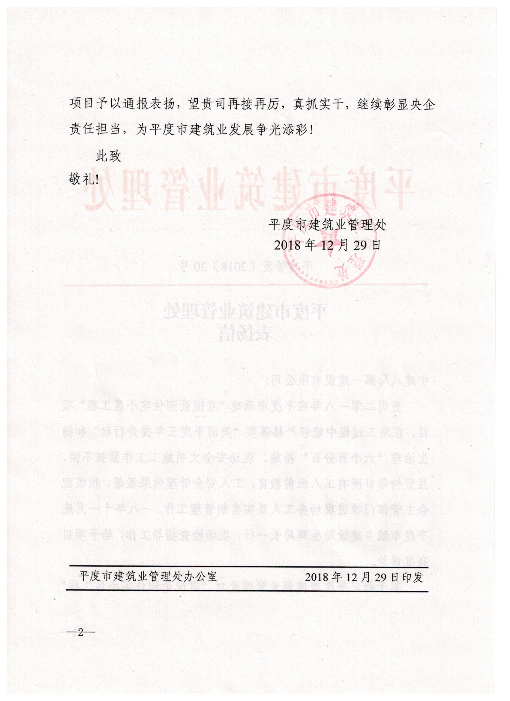 項目自二零一八年開工以來,于一八年十月份順利完成業主預售節點任務,配合業主單位年前圓滿開盤,而且嚴格落實政府主管部門的各項工作要求,項目各項具體工作均切實有效開展,受到平度市城鄉建設局的肯定與表揚。