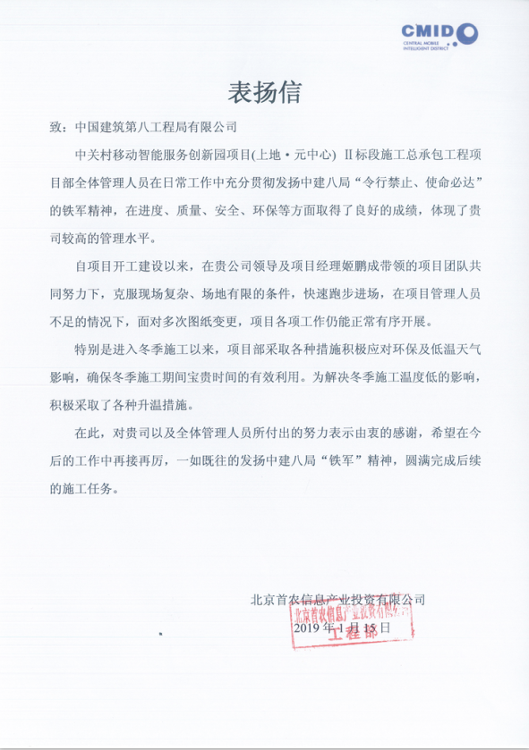近日,上地·元中心項目收到來自北京首農信息產業投資有限公司的表揚信。