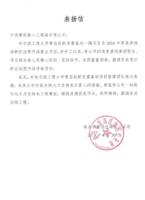 2月14日,哈爾濱工程大學青島創新發展基地一期項目收到來自青島市黃島區建筑工務局的表揚信。