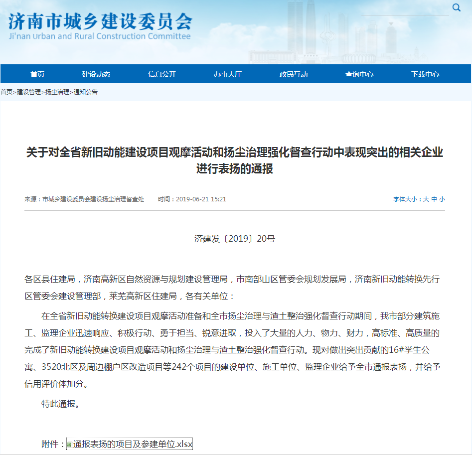 6月21日,濟南市住建局在各大媒體及住建局網站發布最新消息,在山東省新舊動能轉換建設項目觀摩活動準備和濟南市揚塵治理與渣土整治強化督查行動期間,濟南公司以局名義承建的漢峪A5、省科技館新館、高鐵圍合A1項目,及一公司名義承建的平安360超高層、CAR研(山東汽車科創研發總部基地)、萬達茂、歷下總部商務中心等多個項目因高標準、高質量的完成了新舊動能轉換建設項目觀摩活動和揚塵治理與渣土整治強化督查行動任務,受到濟南市住建局全市通報表揚,并給予信用評價體加分。(王曦)