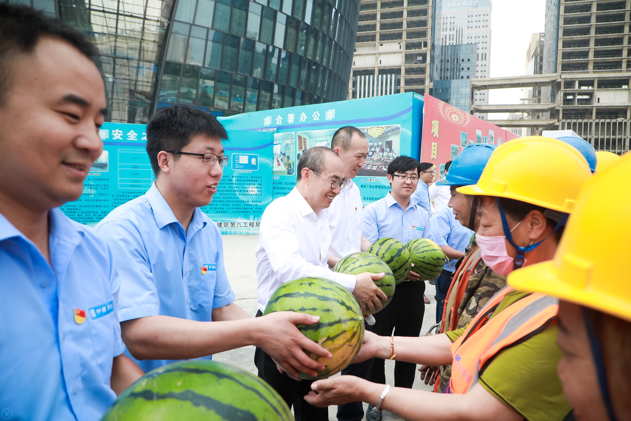 表彰大會結束后,SOHO中國各位領導與麗澤SOHO項目管理團隊合影留念。同時為傳遞對一線職工的關懷與關愛,麗澤SOHO項目黨支部精心組織了夏日“送清涼”活動,黨支部邀請潘石屹、王濤一起為農民工兄弟發西瓜。