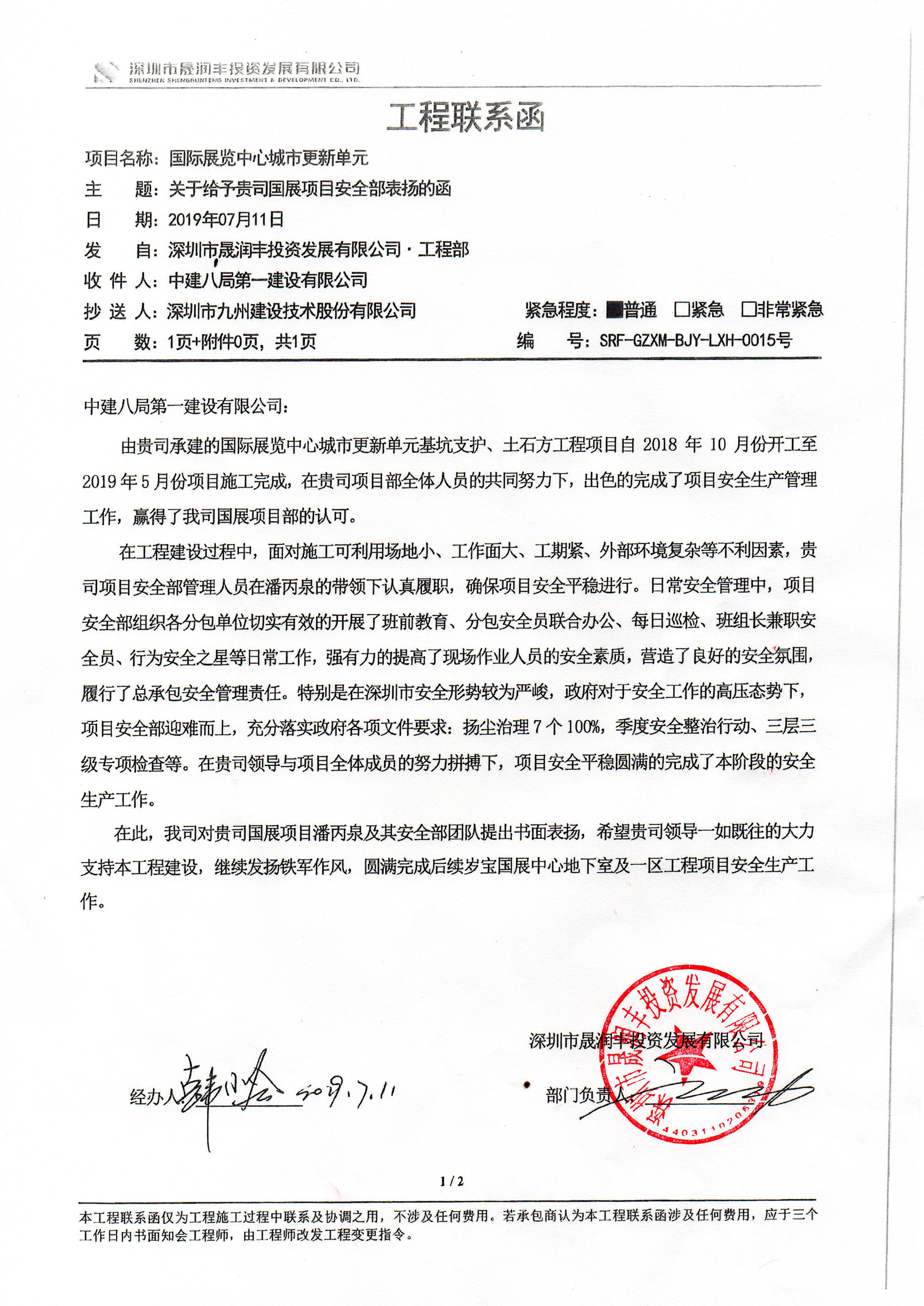 7月11日,國際展覽中心城市更新單元基坑支護、土石方工程項目榮獲業(yè)主深圳市晟潤豐投資發(fā)展有限公司表揚信。本項目自2018年10月份開工至2019年5月份施工完成,在項目部全體人員的共同努力下,出色的完成了項目安全生產(chǎn)管理工作,業(yè)主對項目經(jīng)理王正超和安全總監(jiān)潘丙泉及其安全部團隊提出書面表揚。