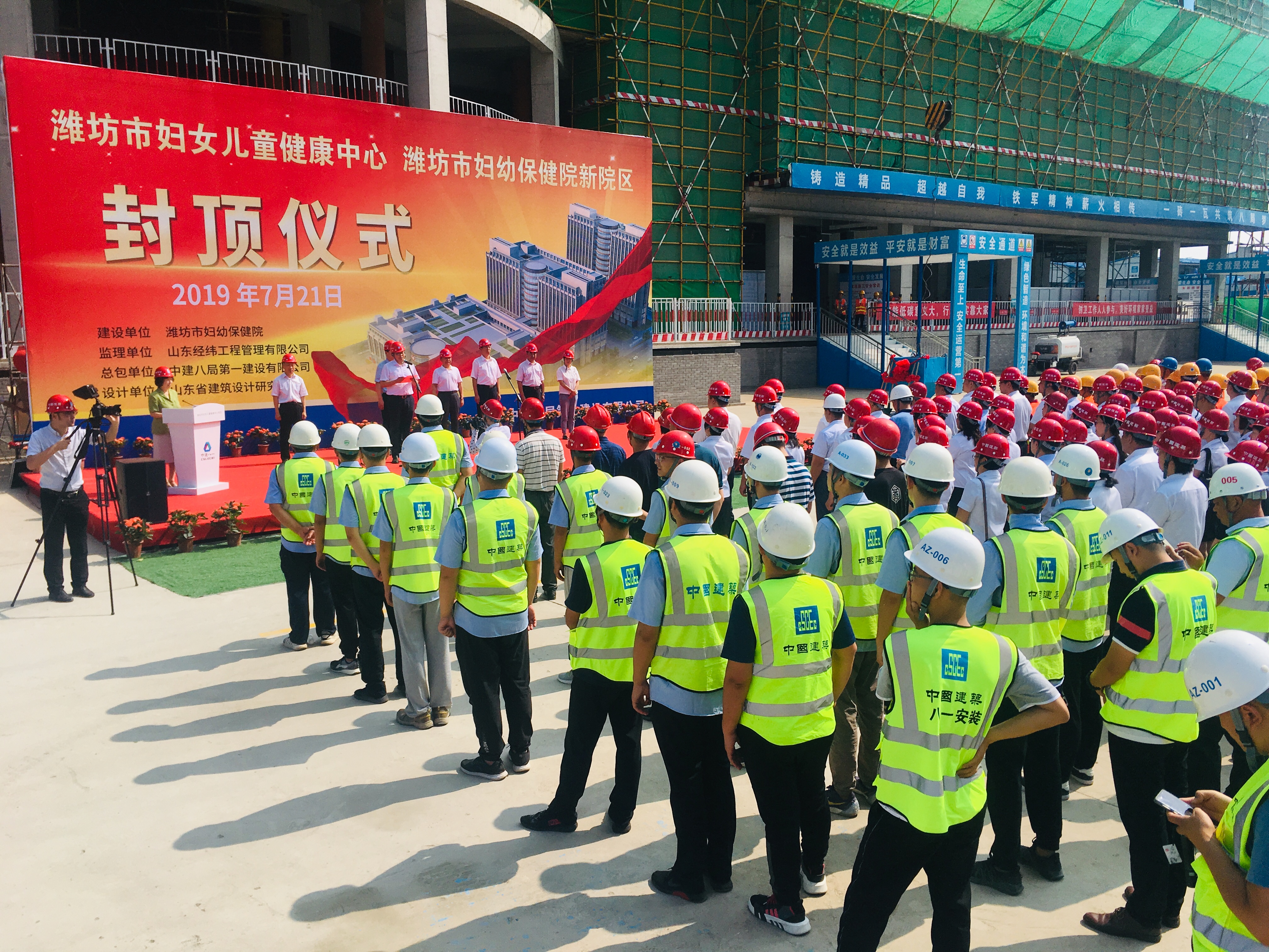 7月21日上午9點18分,伴隨著最后一方混凝土的澆筑到位,市衛健委黨組書記、主任,市中醫藥管理局局長吳海源,市衛健委二級調研員吳桂珍、四級調研員陳偉,高新區黨工委委員、組織部部長賈延慶,高新區衛計局局長葛麗,濰坊市婦幼保健院黨委書記高振忠等院領導班子成員,青島公司總經理周春雨,監理單位等相關領導和職工代表共計100余人共同見證了由我公司承建的濰坊市婦女兒童健康中心項目門診醫技樓主體結構順利封頂。