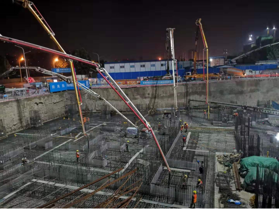 華置萬象天地項(xiàng)目北側(cè)緊鄰工業(yè)南路,南側(cè)為在施工程,西側(cè)緊鄰華潤置地售樓處,只有東側(cè)一條臨時(shí)道路通往基坑里。為保證澆筑速度與澆筑質(zhì)量,項(xiàng)目在傳統(tǒng)的泵送澆筑方式的基礎(chǔ)上,再增加一臺(tái)伸縮式皮帶輸送機(jī)輔助澆筑,共計(jì)投入五臺(tái)汽車泵+一臺(tái)伸縮式皮帶輸送機(jī)組織澆筑。六泵齊發(fā),全速開進(jìn),將狹小場地的利用率真正實(shí)現(xiàn)了最大化,用時(shí)24小時(shí)圓滿完成7000m3混凝土的澆筑任務(wù),實(shí)現(xiàn)了每小時(shí)約300m3的澆筑速度目標(biāo)。
