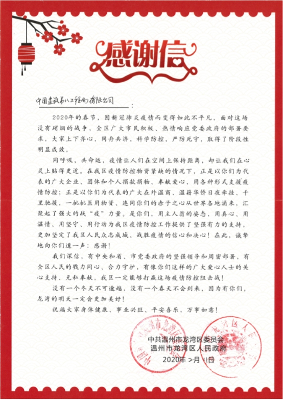 3月2日,中共溫州市龍灣區委、溫州市龍灣區人民政府向溫州高新文化廣場項目發來感謝信,對項目在春節期間在新冠病毒疫情防控上所做出的貢獻表示感謝。