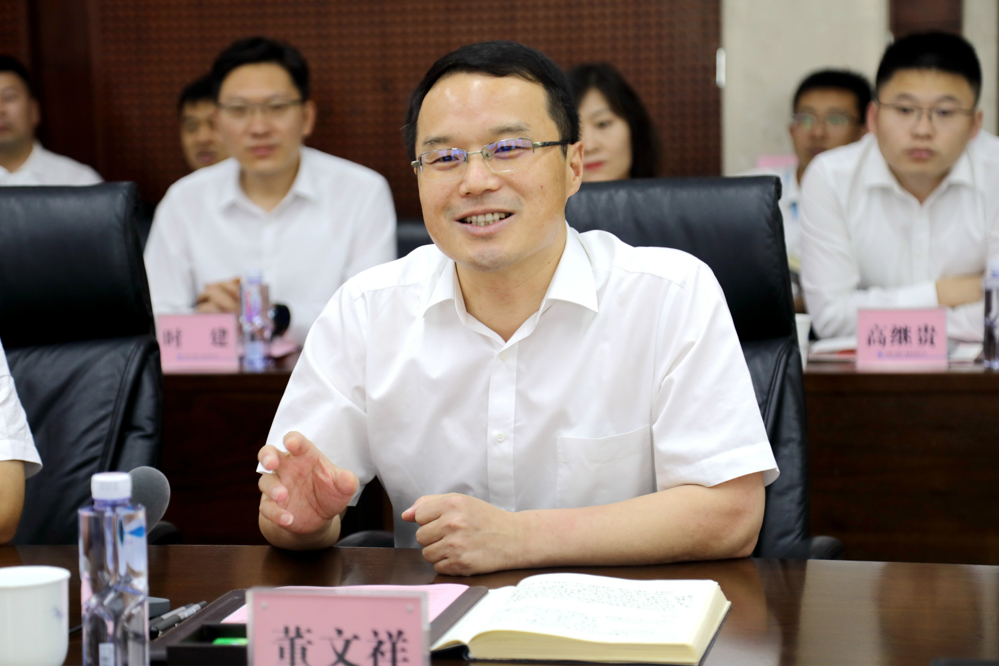 公司黨委書記、董事長董文祥,副總經理劉明,總工程師于科,副總經理、總法律顧問李云,黨委副書記、工會主席劉文納等班子成員及相關部門負責人、二級單位班子成員參與此次交流。
