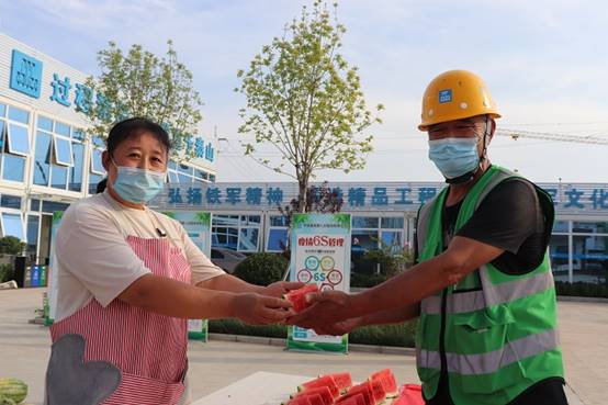 為進(jìn)一步幫助當(dāng)?shù)毓限r(nóng)拓寬銷路,項(xiàng)目工會(huì)組織開展“防疫+防暑”暖心行動(dòng),為一線參建者送上一份夏日清涼,并鼓勵(lì)大家自主購買。7月6日,項(xiàng)目部設(shè)置“愛心餐桌”,工作人員將解暑飲品和西瓜送到即將進(jìn)場施工的建筑工人手中。