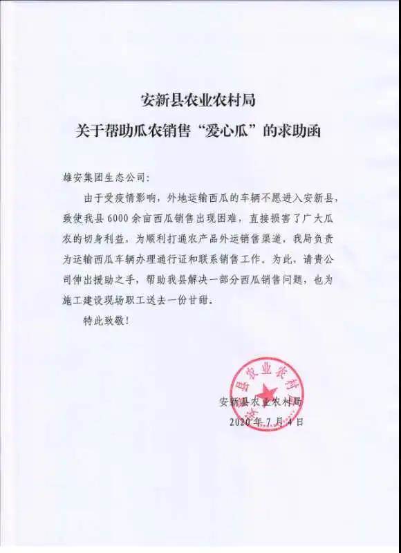 7月4日,中國雄安集團(tuán)生態(tài)建設(shè)投資有限公司收到安新縣農(nóng)業(yè)農(nóng)村局發(fā)來的求助函。公司雄安站樞紐片區(qū)市政道路、綜合管廊、排水管網(wǎng)系統(tǒng)(一期)工程一標(biāo)段項(xiàng)目部積極響應(yīng)業(yè)主單位號(hào)召,當(dāng)即選購滯銷西瓜約60000斤,為當(dāng)?shù)毓限r(nóng)解燃眉之急。