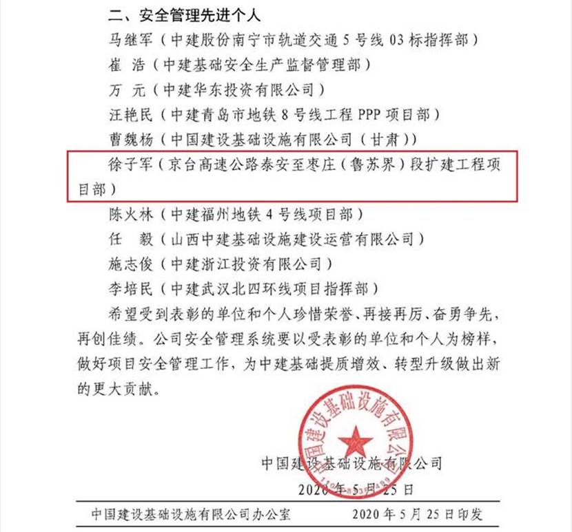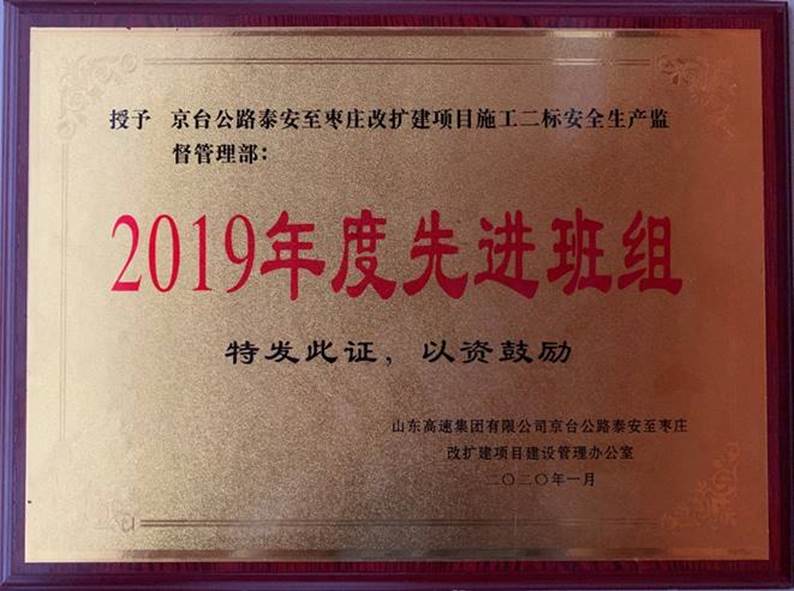 憑借全體人員不懈努力,項目在安全管理方面已榮獲一系列榮譽,包括山東高速集團有限公司2019年度先進班組、中建山東投資有限公司2019年度安全管理先進單位等榮譽稱號,項目安全總監徐子軍還榮獲中國建設基礎設施有限公司年度安全管理先進個人稱號。