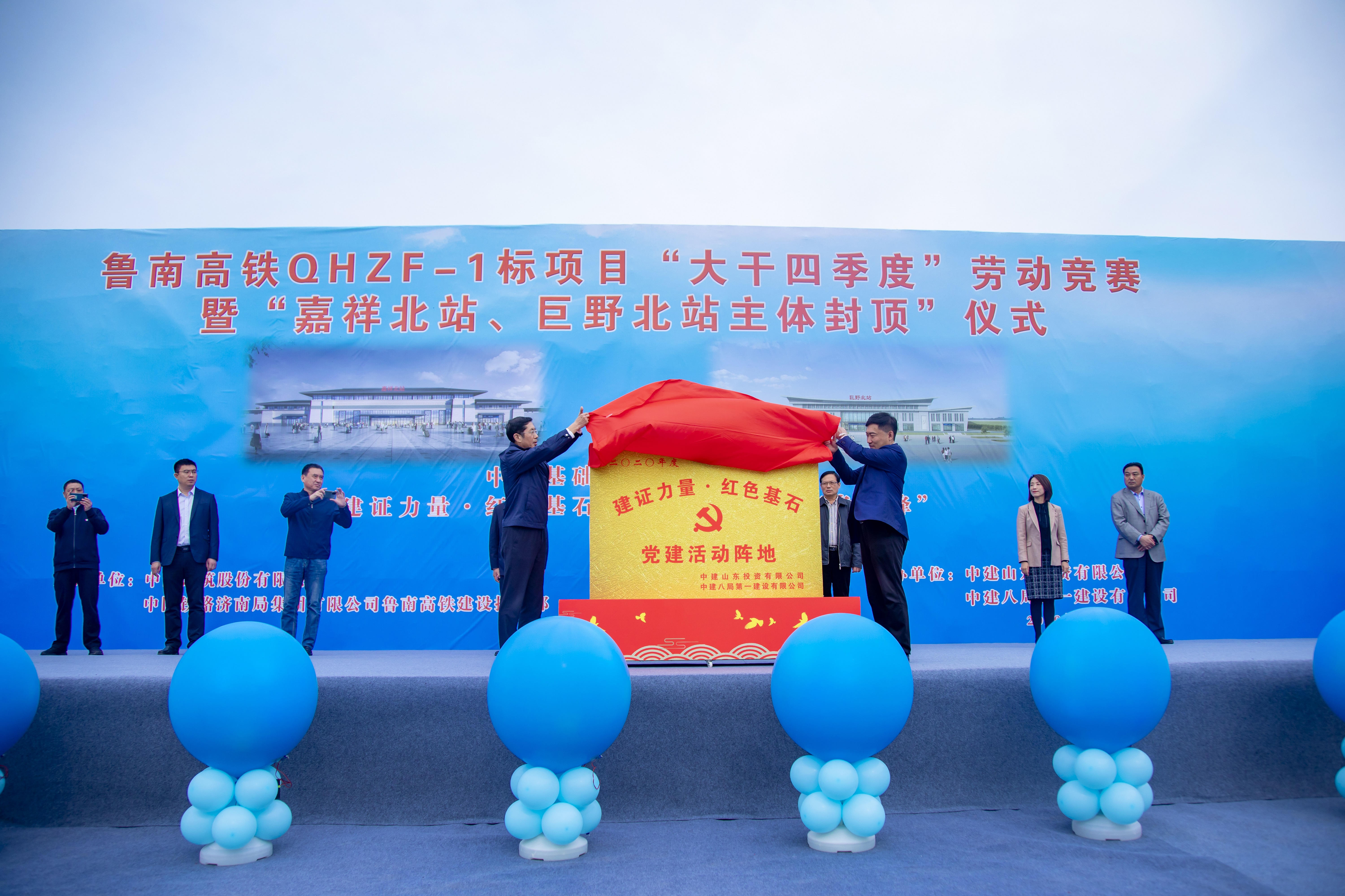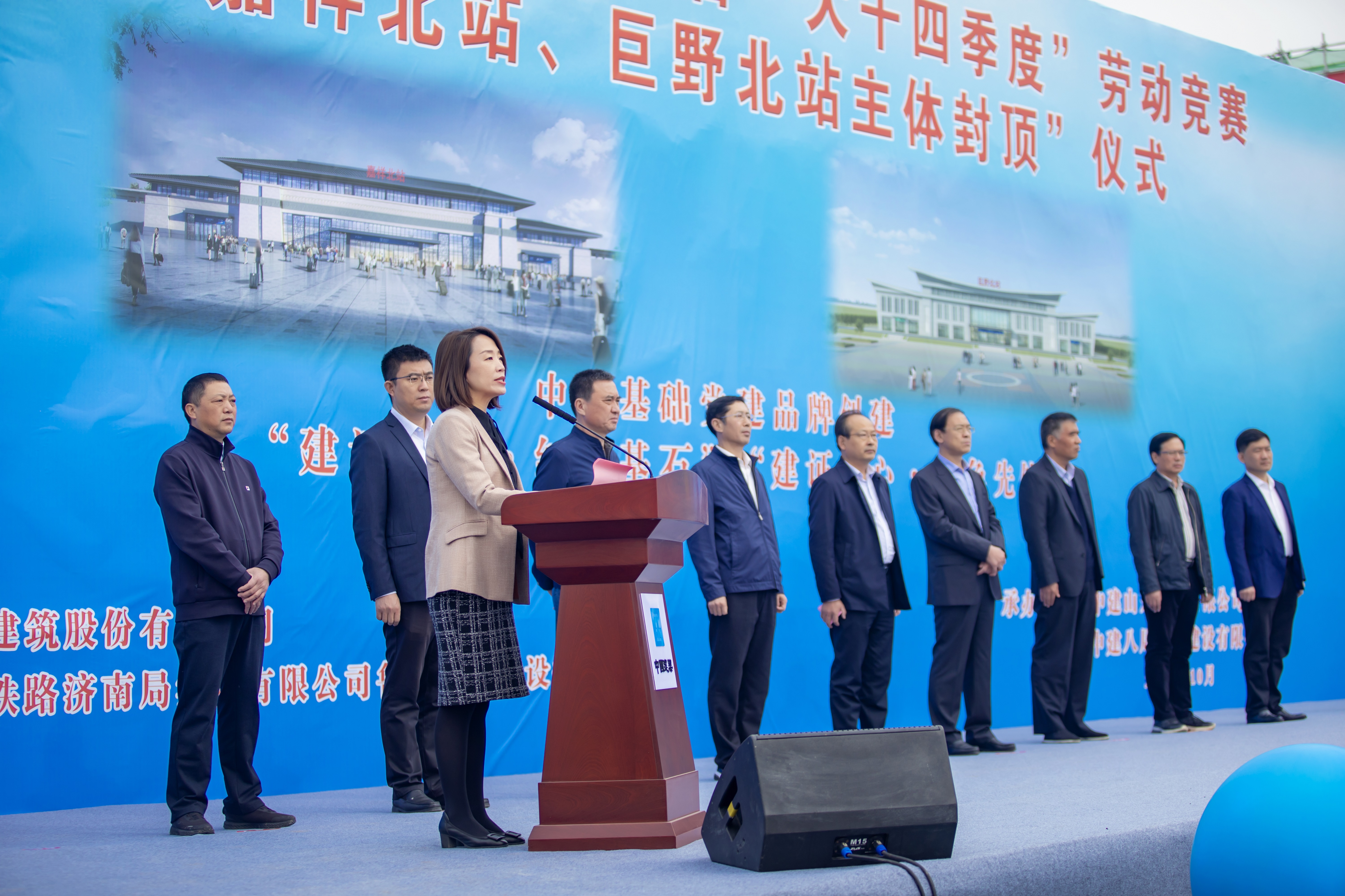 1020日,魯南高鐵站房項目在嘉祥北站舉行嘉祥北站、巨野北站封頂儀式暨大干四季度勞動競賽啟動儀式。山東鐵投集團工會主席張慶星,魯南高鐵公司工會主席王清村,濟寧市鐵路建設領導小組辦公室主任孫作義,中國鐵路濟南局集團公司建設指揮部副指揮長單云波、工會主席張秀泉,魯南高鐵公司濟寧指揮部指揮長李慎祥,中建股份基礎設施事業部助理總經理、中建山東投資有限公司總經理孫智,嘉祥縣交通運輸局局長尹哲學,中建八局一公司黨委副書記、工會主席劉文納,濟南公司黨委書記、總經理霍文濤以及各參建人員120余人參加儀式,儀式由項目指揮長張龍海主持。