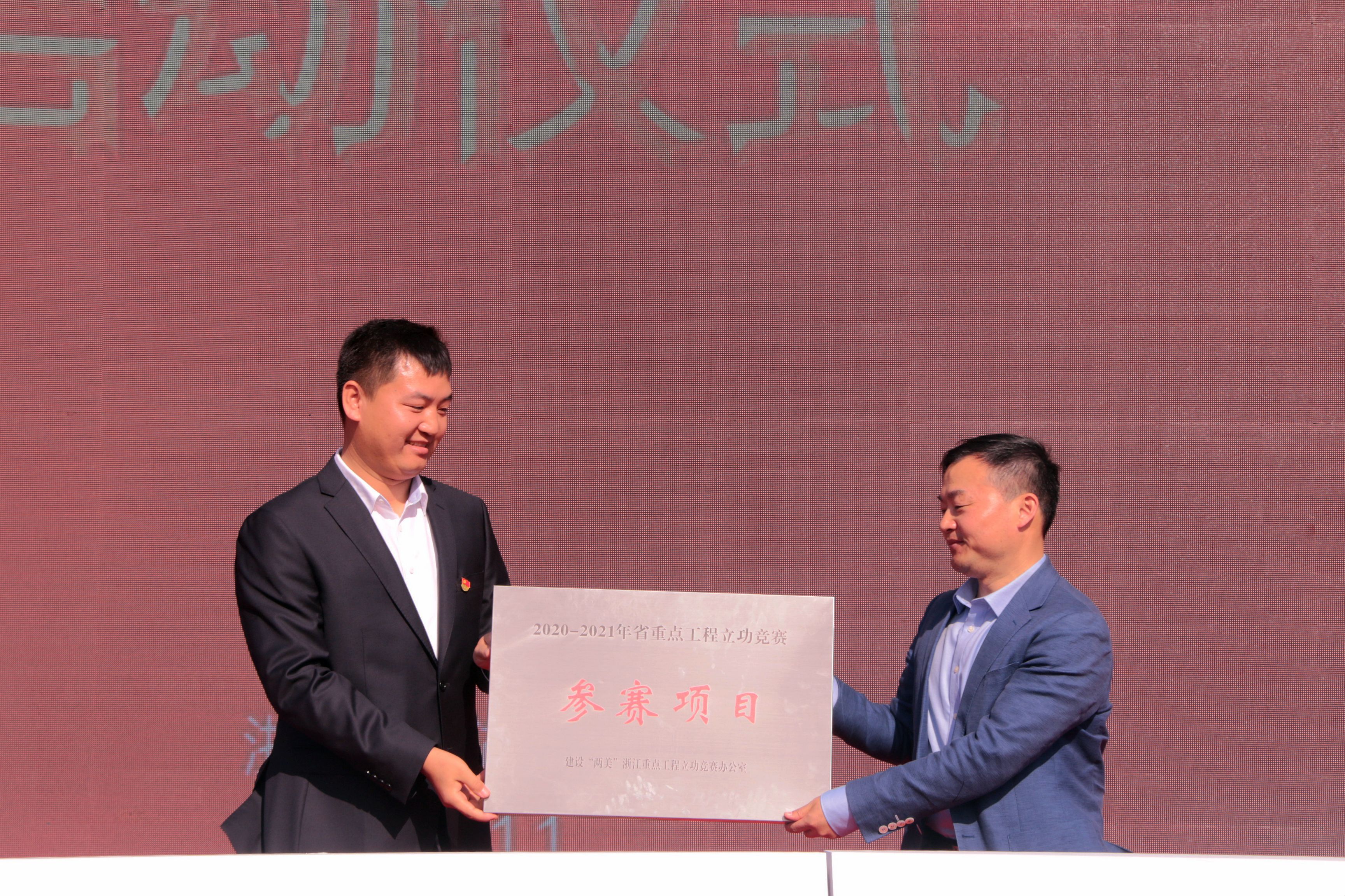 湖州市總工會(huì)副主席楊少章向中國制造2025產(chǎn)業(yè)園建設(shè)項(xiàng)目(二期工程)EPC總承包項(xiàng)目授予“2020-2021年省重點(diǎn)工程立功競賽參賽項(xiàng)目”獎(jiǎng)牌。