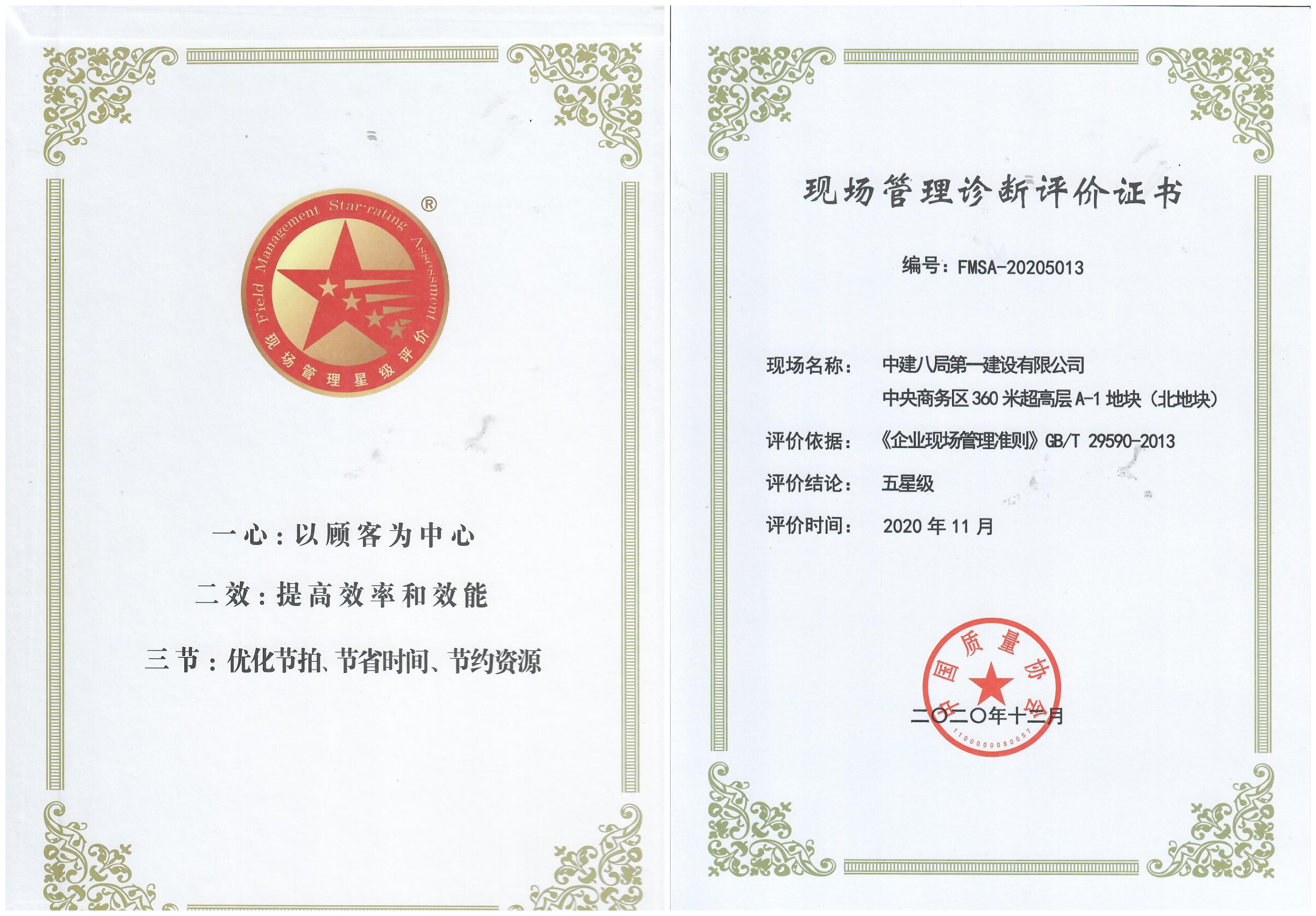 五星現場為全國現場管理星級評價活動的最高榮譽。該評審由中國質量協會于2009年在全國制造業試點,2011年在全國所有服務業、制造業和建筑業推行。2017年度全國共有1200家單位申報,僅有77個項目獲獎,其中建筑行業僅5個,榮譽含金量極高。