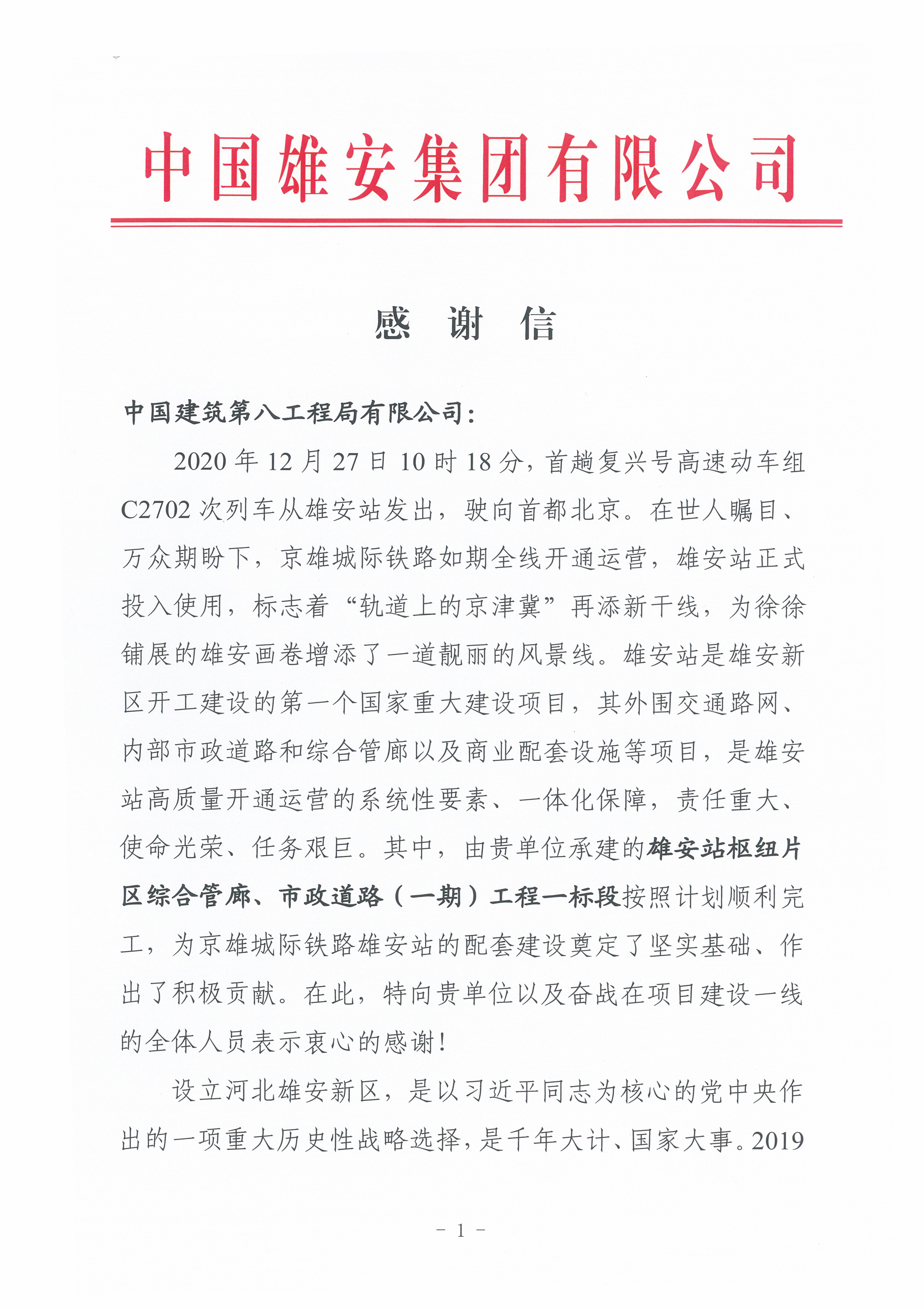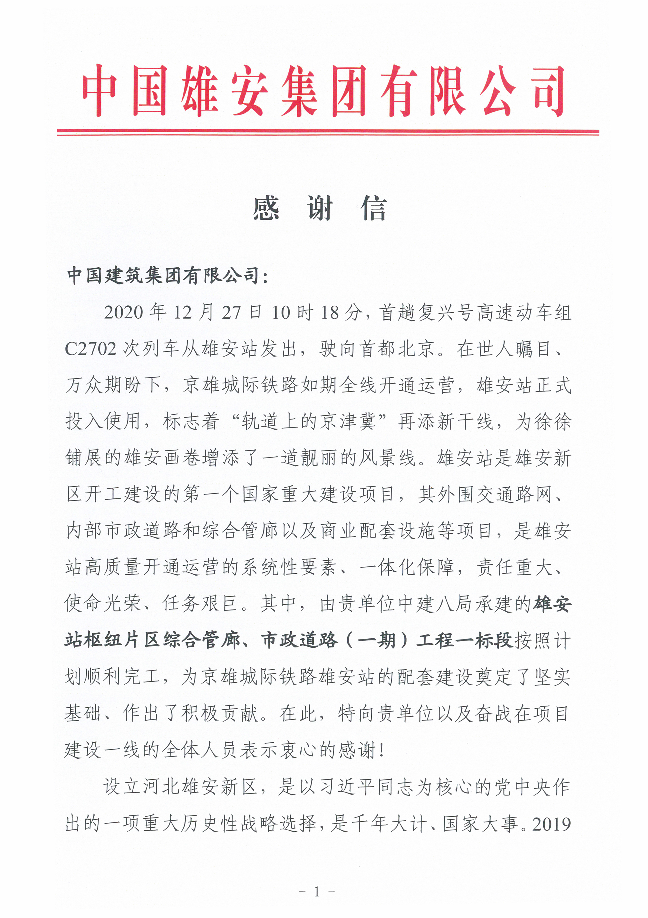 雄安站樞紐片區(qū)市政道路、綜合管廊排水管網(wǎng)系統(tǒng)(一期)工程一標(biāo)段項目收到中國雄安集團發(fā)來的兩封感謝信