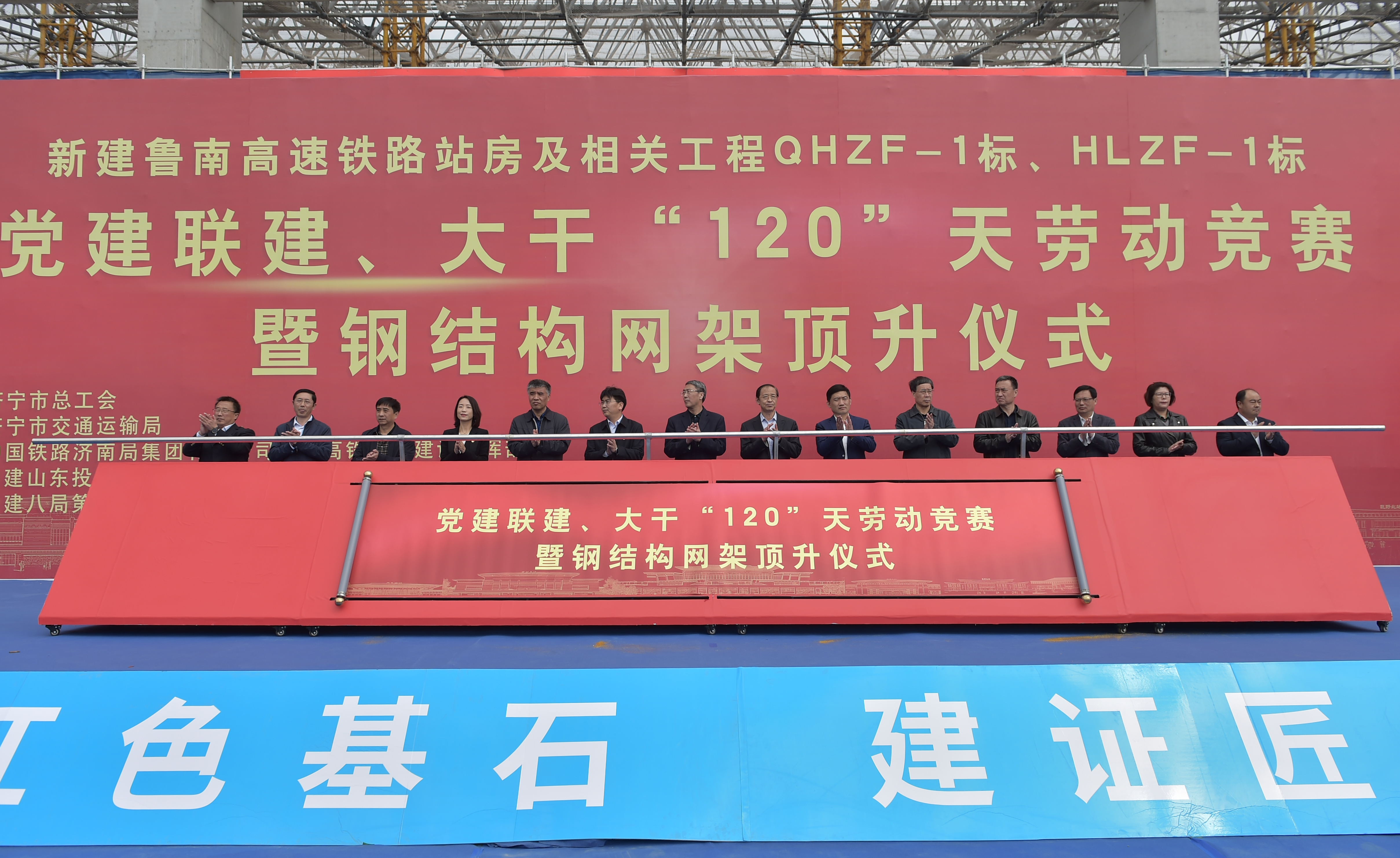 建功新時代,奮進新征程。4月15日,魯南高鐵站房項目在濟寧北站舉行黨建聯建、大干“120天”勞動競賽暨“鋼結構網架頂升”儀式,以黨建促進生產,以競賽激發斗志,吹響奮進攻堅沖鋒號。