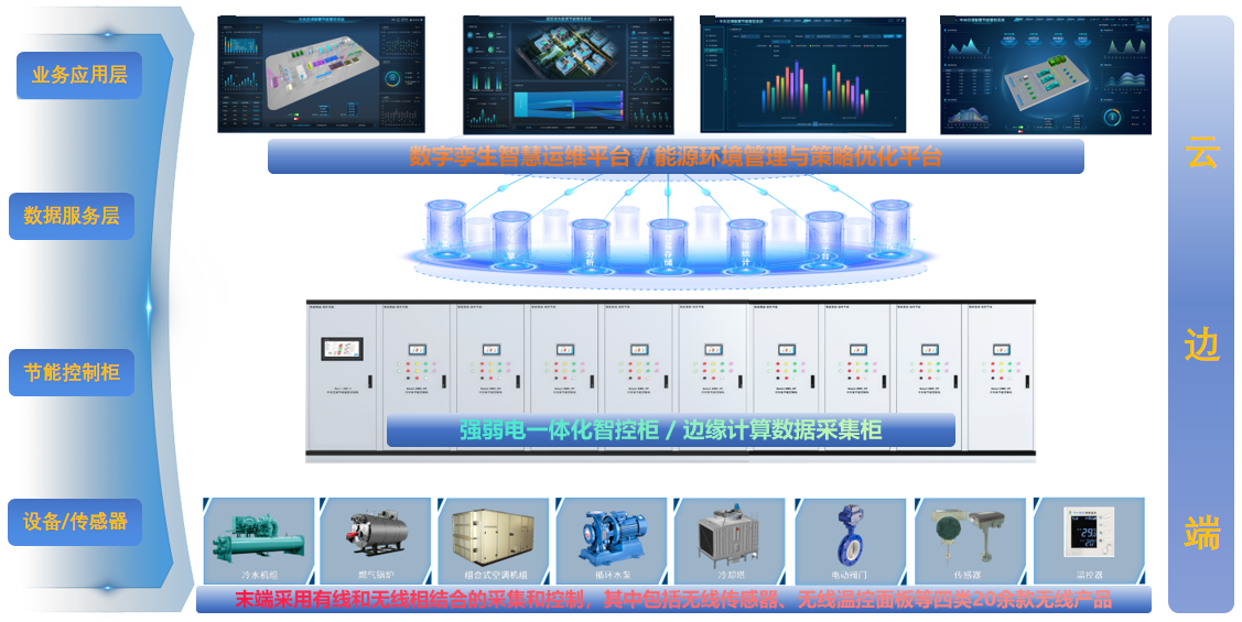 云層作為一體化架構(gòu)的“智慧大腦”,集成了數(shù)字孿生智慧綜合運(yùn)維平臺與能源環(huán)境管理與策略優(yōu)化平臺兩大核心平臺,綜合運(yùn)維平臺以數(shù)據(jù)為基礎(chǔ),構(gòu)建出建筑的數(shù)字畫像,實(shí)現(xiàn)暖通、照明、安防等多系統(tǒng)的集成管理,提供智慧高效、低碳節(jié)能的場景應(yīng)用;邊緣層由強(qiáng)弱電一體化智控柜與邊緣計算數(shù)據(jù)采集柜組成,它們?nèi)缤吧窠?jīng)網(wǎng)絡(luò)”,負(fù)責(zé)就地控制、遠(yuǎn)程監(jiān)控及數(shù)據(jù)處理,強(qiáng)弱電一體化智控柜將強(qiáng)電控制與智能化自控完美融合,實(shí)現(xiàn)設(shè)備的集中管理與能效優(yōu)化;終端層由無線低功耗傳感器、無線聯(lián)網(wǎng)型溫控器、無線智能照明系統(tǒng)及無線遠(yuǎn)傳儀表等四類20余款產(chǎn)品構(gòu)成,它們?nèi)缤案泄倨鞴佟睆V泛分布于建筑各處,實(shí)時感知環(huán)境變化。