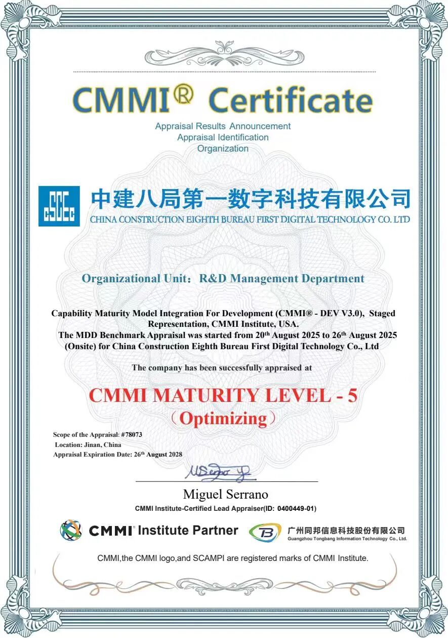 近日,中建八局第一數(shù)字科技有限公司成功通過(guò) CMMI-DEV V3.0 成熟度五級(jí)(簡(jiǎn)稱 CMMI5 級(jí))認(rèn)證,該認(rèn)證是全球軟件領(lǐng)域的最高級(jí)別認(rèn)證,標(biāo)志著公司在軟件研發(fā)、流程化管理與交付運(yùn)維能力上達(dá)到行業(yè)一流水平,數(shù)字化轉(zhuǎn)型取得關(guān)鍵成效。