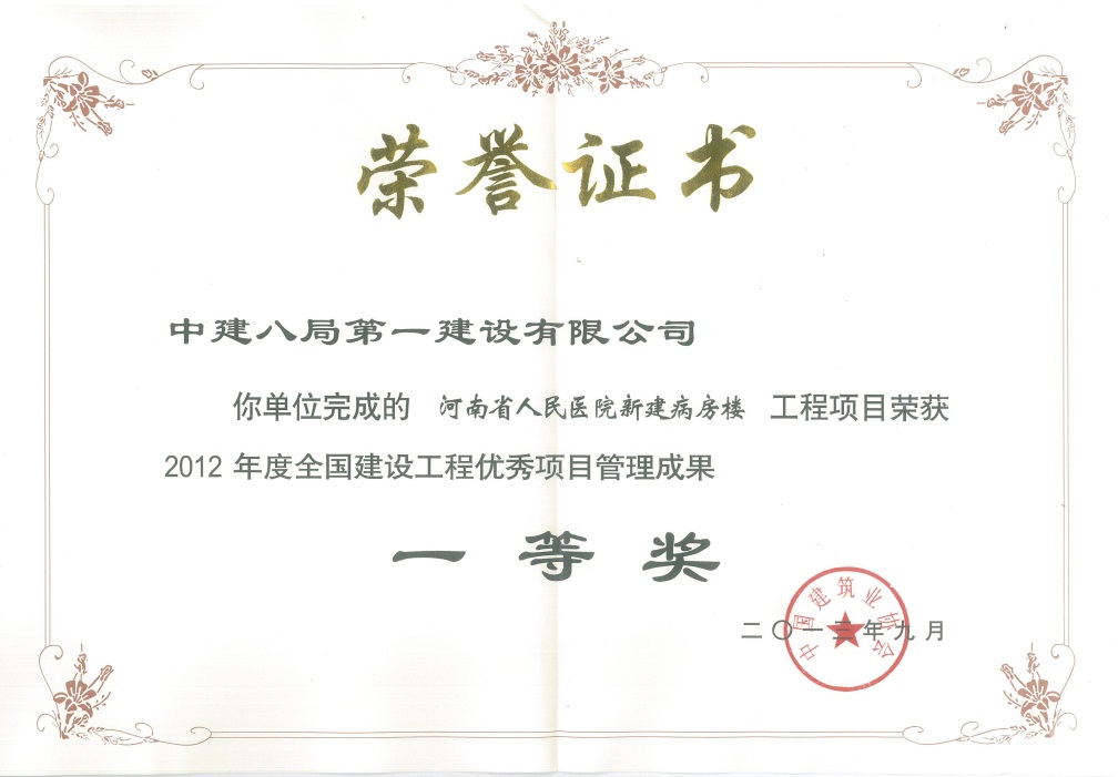 河南省人民醫(yī)院新建病房樓項目榮獲“全國建設工程優(yōu)秀項目管理成果”一等獎