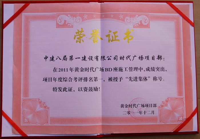 據悉,黃金時代廣場項目經理部積極響應局號召,深入落實準軍事化管理相關精神,以精細管理為主線,加強技術質量管理,加大開源節流力度,在質量、工期、安全等各個方面取得了較好的成績。先后榮獲局“準軍事化管理示范項目”、“山東省安全文明示范工地”、“國家AAA級安全文明誠信工地”及“總公司2010年度CI創優金獎”等榮譽稱號。