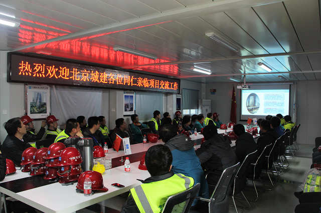 北京城建同仁一行先與項目部進行了座談交流,隨后現場參觀。麗澤SOHO項目總工姬祥就項目的建設情況、現場標準化管理、安全文明施工、項目BIM應用及技術質量管理向交流團進行了深入介紹。交流會結束后,交流團重點考察了現場施工情況,并對部分工程的技術優化進行了交流探討。