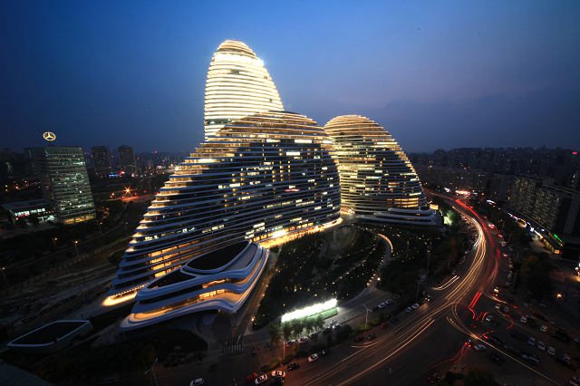望京SOHO位于北京市朝陽(yáng)區(qū)望京街與阜安西路交叉路口,由世界著名建筑師扎哈 ? 哈迪德設(shè)計(jì),是從首都機(jī)場(chǎng)進(jìn)入市區(qū)的第一個(gè)引人注目的高層地標(biāo)建筑,被稱為“首都第一印象建筑”。與此同時(shí),望京SOHO也與水立方、鳥巢等一起成為了北京的新地標(biāo)。望京SOHO采取了動(dòng)態(tài)設(shè)計(jì)理念,仰視時(shí)猶如三座相互掩映的山峰,俯視時(shí)宛似游動(dòng)嬉戲的錦鯉。其獨(dú)特的曲面造型使建筑物在任何角度都呈現(xiàn)出動(dòng)態(tài)、優(yōu)雅的美感。塔樓外部被閃爍的鋁板和玻璃覆蓋,與藍(lán)天融為一體。此外,望京SOHO屬于綠色環(huán)保建筑,推行綠色建筑理念,取得了美國(guó)LEED綠色認(rèn)證標(biāo)準(zhǔn)。
