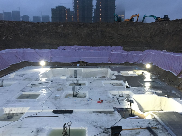 施工期間,合肥出現了二十幾天的連續陰雨天氣,基坑支護未施工,出現了多處土方坍塌,新澆墊層被埋。面對種種困難,項目部迎難而上,調集了九臺大挖,24h連續作業,保證了基坑的安全。
