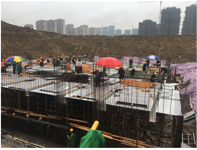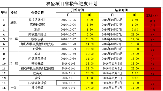 售樓部主體施工期間,項目部編制了詳細的施工進度計劃,計劃精確到小時,24小時兩班輪流不間斷施工,保證了地下室兩層和地上一層主體結構在20天內的完成。