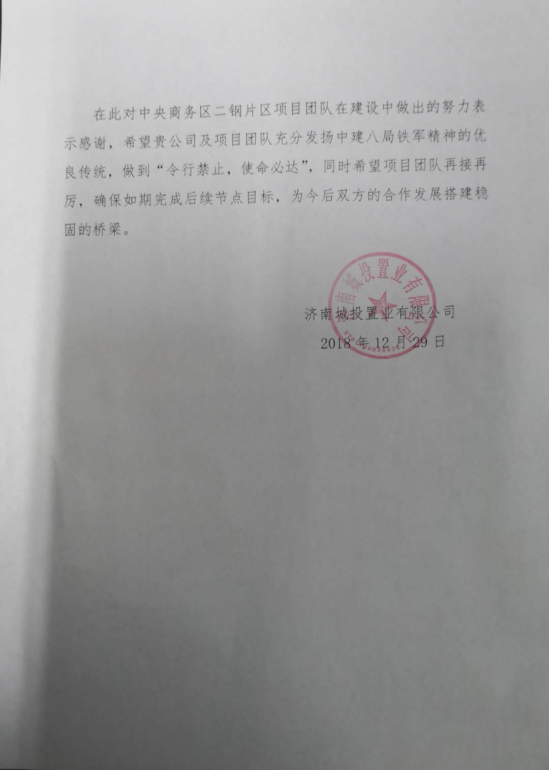 1月5日上午,中央商務區安置區項目收到濟南城投置業有限公司的表揚信。