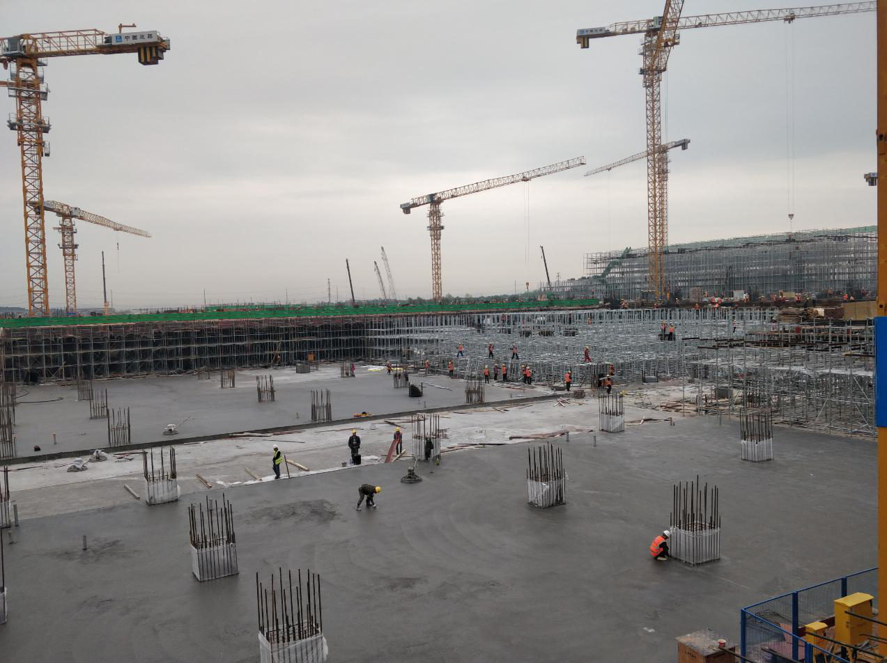 主廠房整個基礎總占地面積15.5萬平方米,自3月5日正式開始基礎階段施工以來,歷時25天,完成了21.5萬方的土方開挖。歷時15天,完成了19萬平方的防水卷材施工。歷時39天,完成了30多萬方混凝土的澆筑。