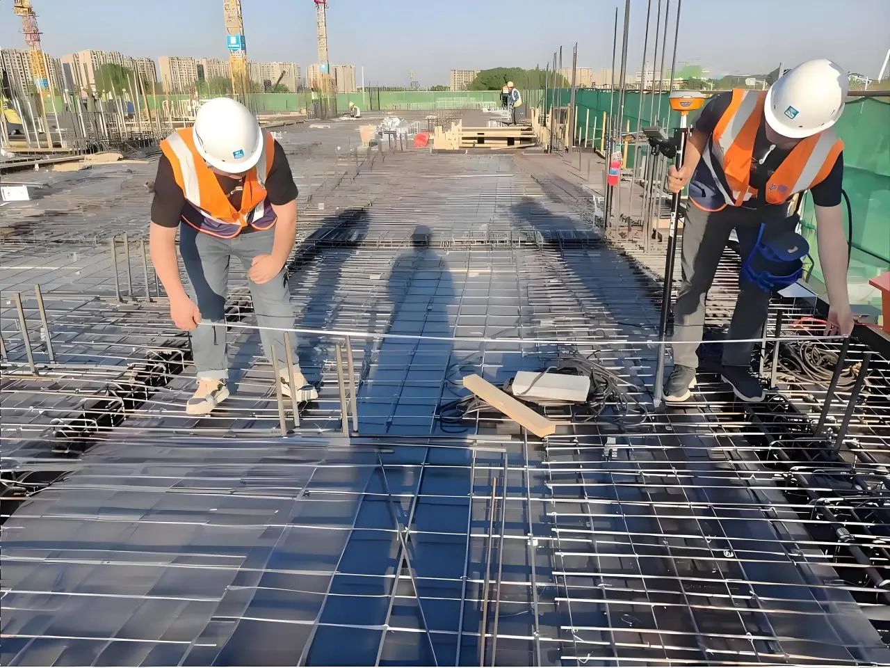 項目在主體結構施工階段,創(chuàng)新采用RTK實時動態(tài)定位技術,懸挑架所有埋件位置支持一鍵定位,20分鐘可完成3000平方米埋件位置復核,采用方圓扣龍骨模板體系技術,有效提高模板垂直度、平整度與施工效率。