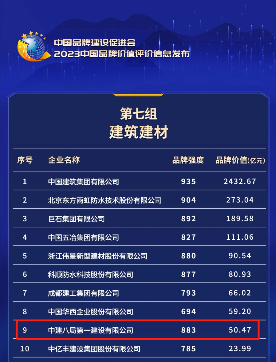 近日,在2023年中國品牌日活動期間,新華社、浙江省人民政府、中國品牌建設(shè)促進(jìn)會、中國資產(chǎn)評估協(xié)會等單位聯(lián)合發(fā)布了“2023年中國品牌價(jià)值評價(jià)信息”。中建八局一公司以品牌強(qiáng)度883、品牌價(jià)值50.47億元位列建筑建材行業(yè)第9位。
