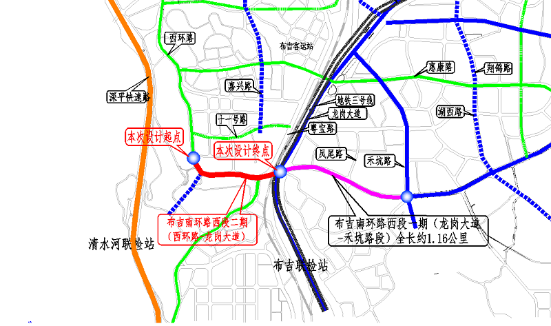 布吉南環路(西環路至禾坑路段)建設工程,由我司代建,位于深圳市布吉街道,西起現狀西環路與十一號路交點,東至與現狀禾坑路交點,道路全長約2.4km。布吉南環路的建設對于完善中部物流組團路網結構,促進組團經濟社會的發展,實現其規劃目標具有重要的意義。