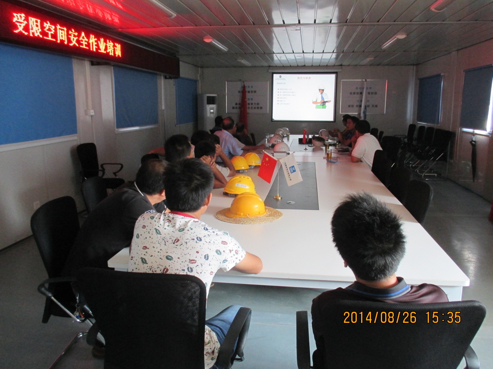 2014年8月26日下午15:30, 廣州香港馬會安裝項目部組織安裝管理人員、項目安全員、馬會安全負責人、馬會安裝負責人、監理和工人在項目會議室召開受限空間安全作業培訓會議。會議內容:會議根據項目現場工人要到雨水、排水管道內清理泥沙及維修,面臨的施工環境存在生物危害如毒蛇,有毒有害氣體,缺氧等,為確保每個施工人員的生命安全及工程順利施工,重點講解了什么是受限空間,在受限空間內作業的危險,香港馬會受限空間作業安全工作規范和程序,受限空間內施工的重點注意事項,緊急營救方案的要求,必須配備的各種安全措施及氣體檢測工具。會議后,就施工中要面對的細節問題與工人進行了深入的溝通、交流,達到了會議培訓的目的。
