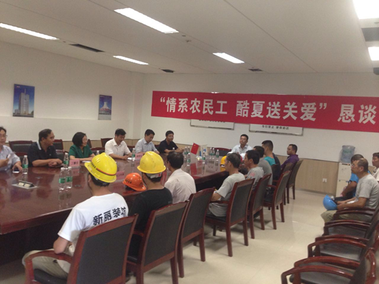 8月5日,濟南市人社局局長王擁華、濟南市勞動就業辦公室主任黃厚安等領導蒞臨濟南分公司銀豐財富廣場項目,為農民工兄弟帶來了洗化等防暑降溫用品,并舉行了“情系農民工、酷夏送關愛”懇談會。