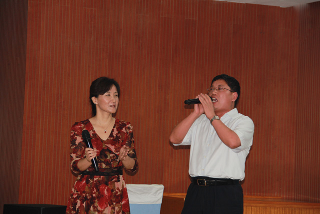 “揮揮手微笑著告別昨天,擁抱更蔥蘢的未來”,19點30分,晚會在一首《最美的答案》中拉開序幕。隨后大家紛紛亮出自己的才藝,模仿大比拼、小品、歌劇、合唱等精彩的節目將晚會逐步推入高潮。新員工王政模仿的費玉清,無論從聲音還是形體動作上都惟妙惟肖,讓大家贊口不絕。小品《一公司小夫妻》采用經典――《實話實說》風格,演繹了大家眼中的一公司,其中的精彩對話讓大家捧腹。教官團隊表演的格斗、拳術、棍術也讓大家大開眼界,為晚會增添了另一道光彩。面對現場熱烈的氣氛,公司領導也紛紛上臺獻上了精彩的表演,將整個晚會推向另一個高潮。董事長李永明為大家傾情演唱了《雨花石》和《活出個樣子來給自己看》,希望新員工們像雨花石學習,經得住平凡與寂寞,在平凡的崗位上做出不平凡的業績。黨委書記許紅聲情并茂,為大家朗誦了詩歌《青春萬歲》,展現了青春的無限美好與活力,她還演唱了《隱形的翅膀》,鼓勵大家在逆境中也要善于看到希望,堅強的奮斗下去。人力資源總監王有標也為大家演唱了《凡人歌》,贏得了陣陣掌聲。培訓人員工作團隊也為大家獻上了《相逢是首歌》。