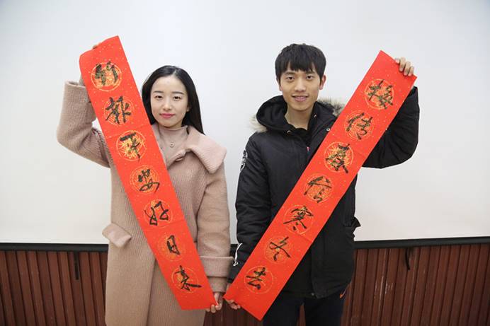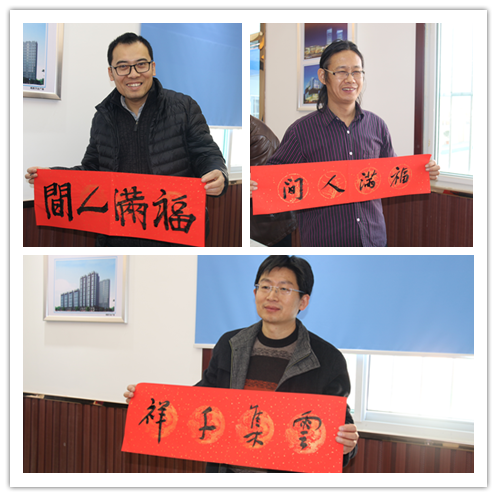 1月14日,公司濟南中央商務區(qū)安置區(qū)(CBD)項目熱鬧非凡。山東省青年書協(xié)常務副主席李成軍,省青年書協(xié)副主席兼秘書長黨現(xiàn)強,省青年書協(xié)副秘書長、山東財經(jīng)大學副教授王子庸,省青年書協(xié)理事、市青年書協(xié)副主席王奇嵩四位書法家及公司書法協(xié)會成員徐偉、吳天均、張廣超,現(xiàn)場揮毫,一刻不得閑,一條條寫有新春祝福的對聯(lián),散發(fā)著清新墨香,一張張桌子前人頭攢動。