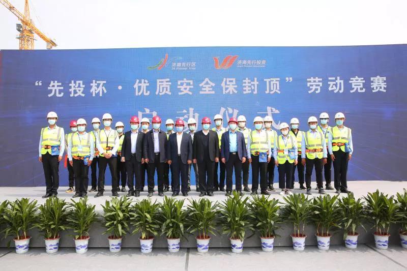 濟南先行投資有限責任公司董事長兼總經理丁杰、先投產發公司董事長兼總經理賈為、中建八局一公司專務薛樹海、工會工作部部長方健、濟南公司副總經理陳前鐘等出席活動。薛樹海在致辭中表示,中建八局一公司將在保質保安全的前提下,高標準完成各項節點計劃。