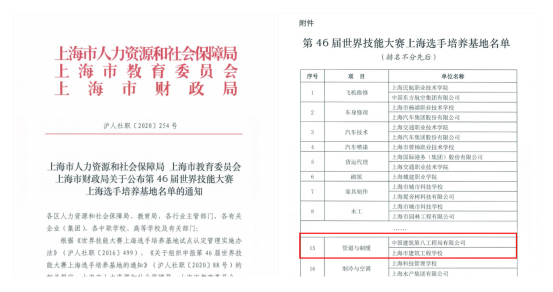 近日,上海市人力資源和社會保障局、上海市教育委員會、上海市財政局聯合公布第46屆世界技能大賽上海選手培養基地名單,坐落于公司的世界技能大賽中建八局實訓基地(管道與制暖項目)名列其中,被認定為第46屆世界技能大賽上海選手培訓基地。
